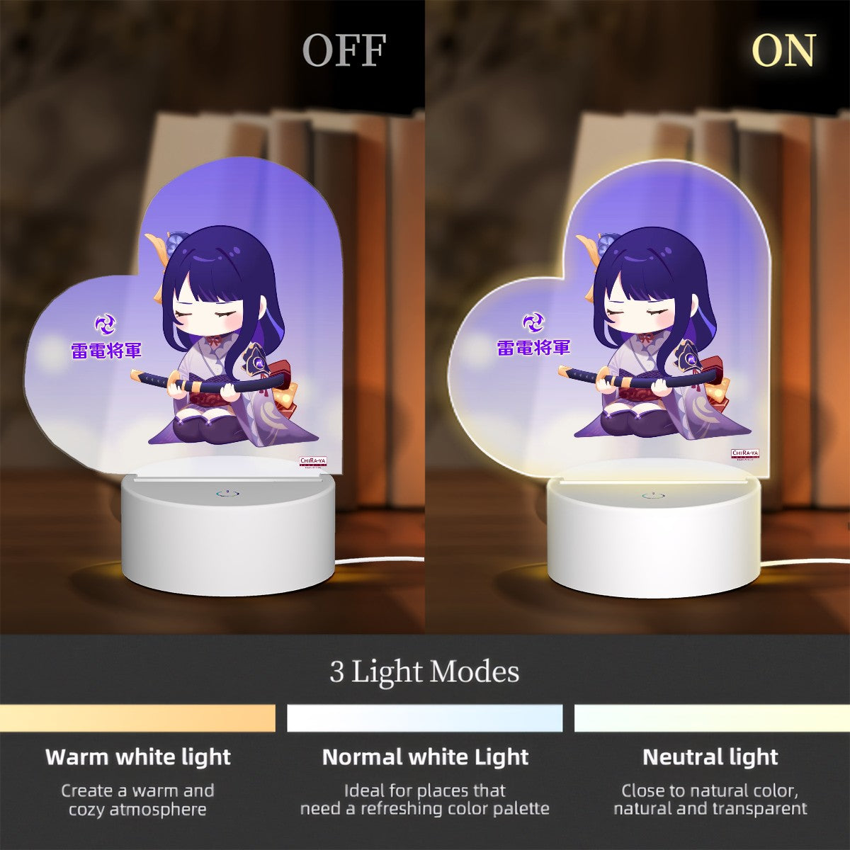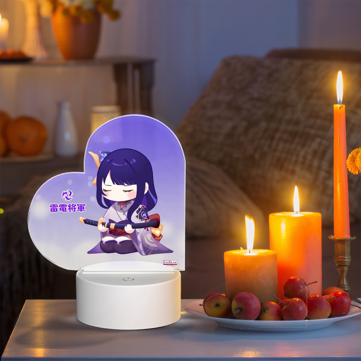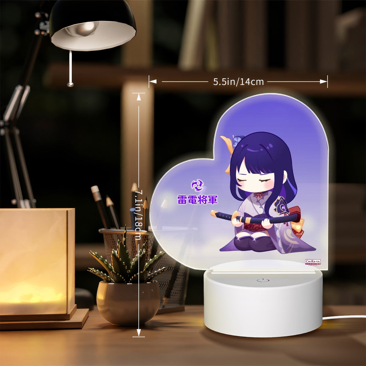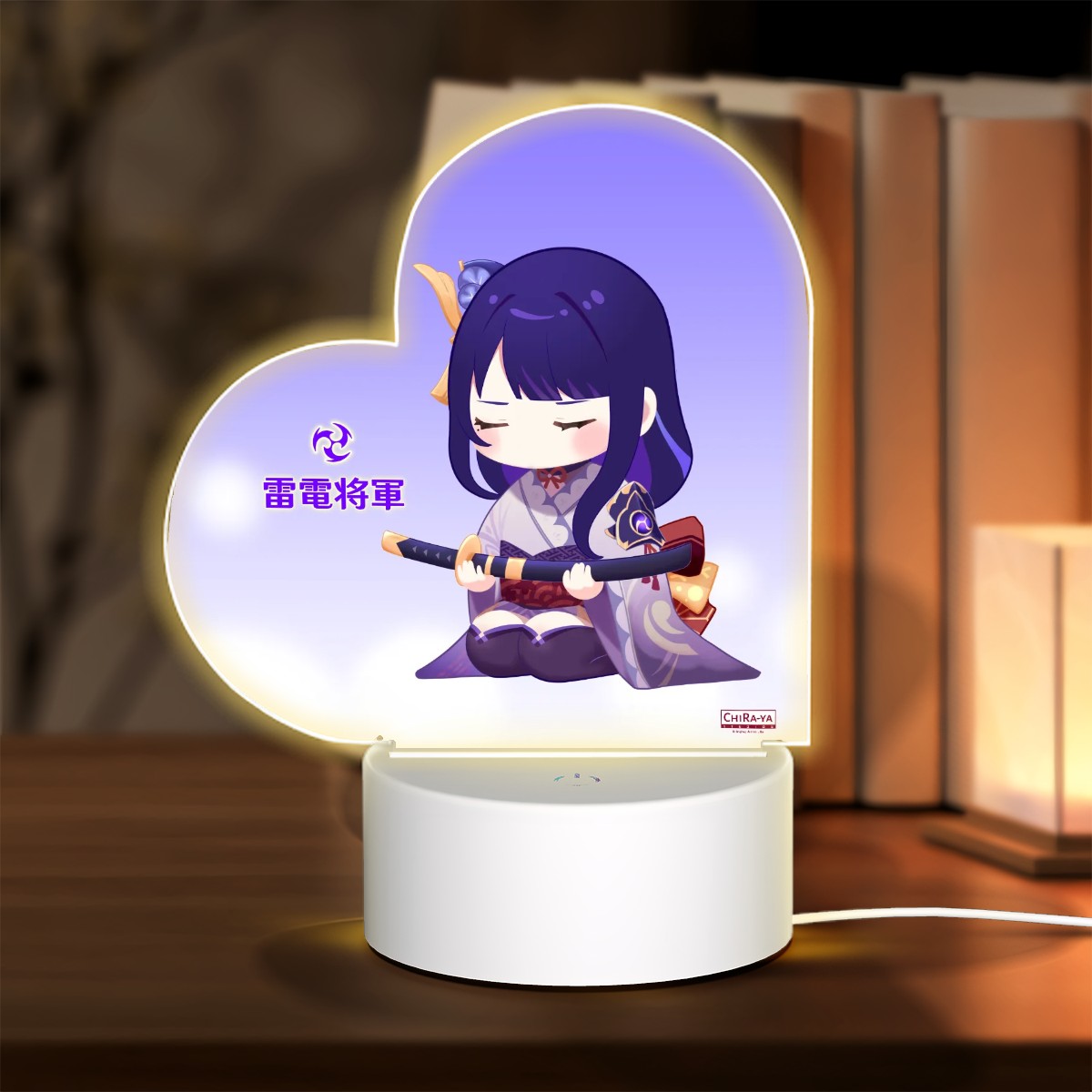 Enhance your living space with an original Chiraya Studios Genshin Impact heart-shaped night light, featuring our Irodori Festival-inspired statue of Inazuma's eternal shogun and Electro Archon, Raiden Ei!