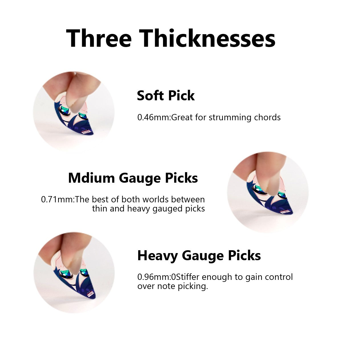 Package Includes: This pack contains 12 guitar picks in 3 different gauges/thicknesses: 0.46mm (soft pick), 0.71mm (medium gauge), and 0.96mm (heavy gauge). Additionally, it comes with a transparent plastic box measuring 2.1" x 2.1" x 0.9" for convenient storage.