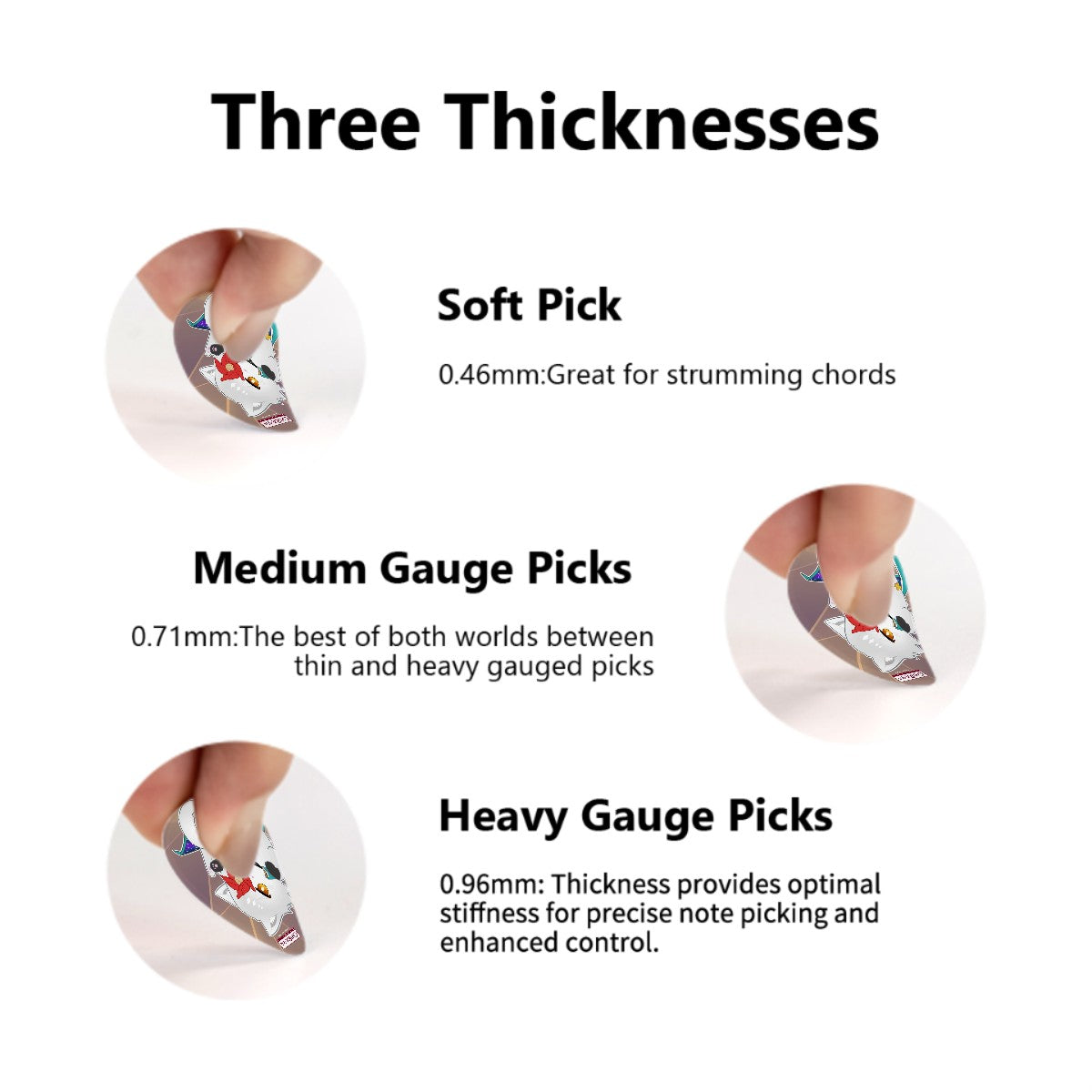 Package Includes: This pack contains 12 guitar picks in 3 different gauges/thicknesses: 0.46mm (soft pick), 0.71mm (medium gauge), and 0.96mm (heavy gauge). Additionally, it comes with a transparent plastic box measuring 2.1" x 2.1" x 0.9" for convenient storage.