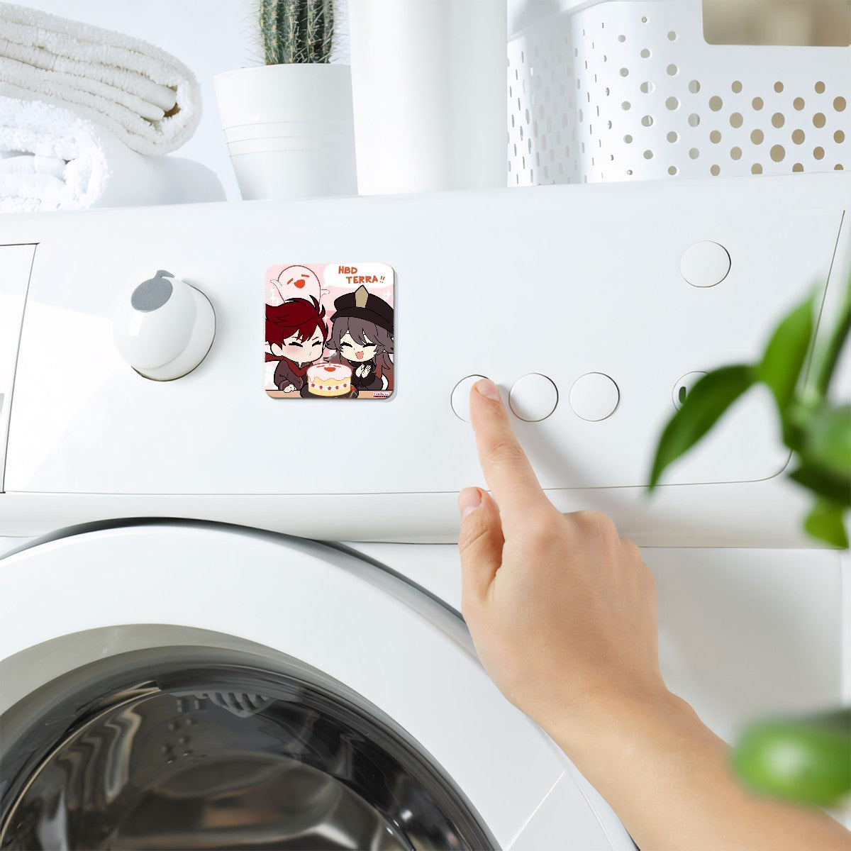 Add a touch of cuteness to your home decor with this adorable and nostalgic Chiraya Studios acrylic magnet, featuring the 2022 Official Birthday Art of our co-founder and official mascot, Terraglotte and his Pyro queen, Hu Tao!